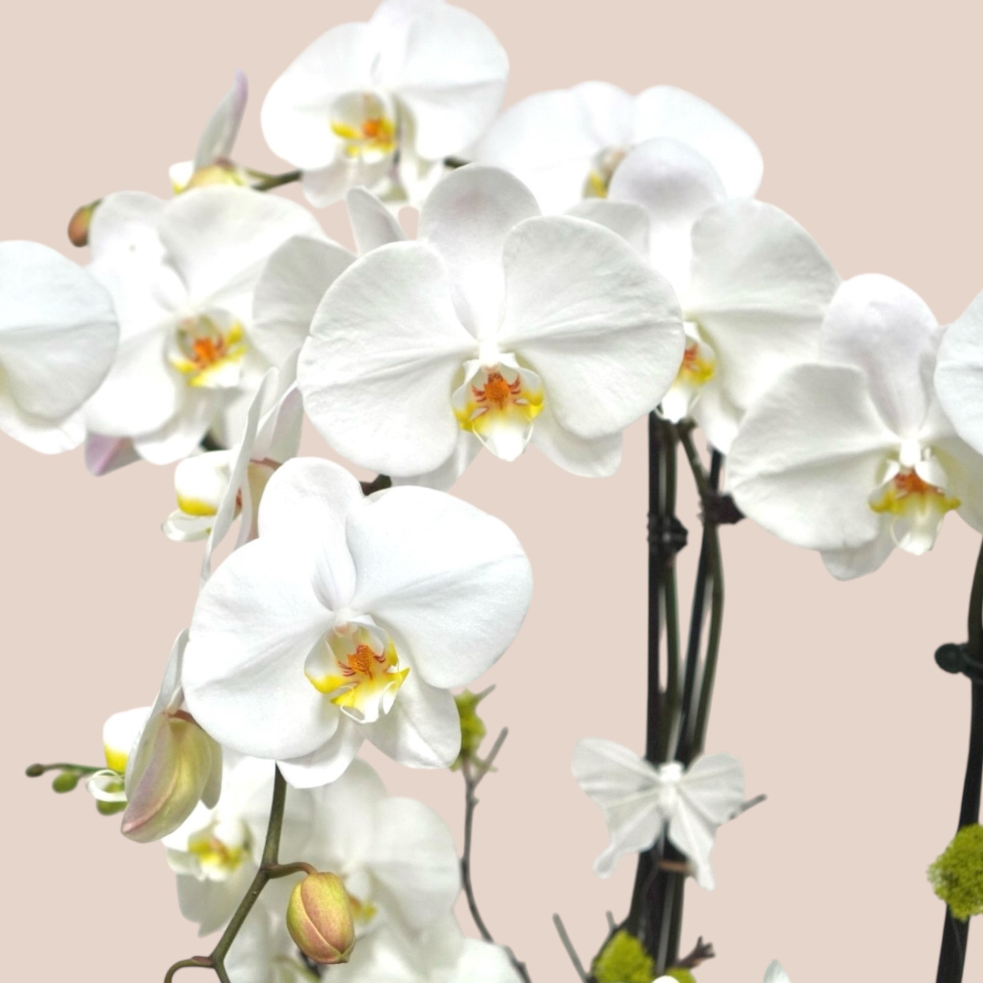 • Features cascading white Phalaenopsis orchid blooms in a full, lush arrangement