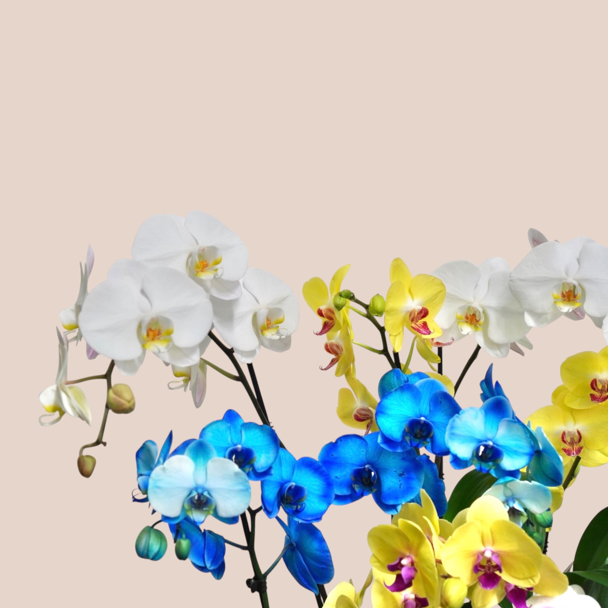 • Vibrant arrangement of mixed Phalaenopsis orchids in multiple colors