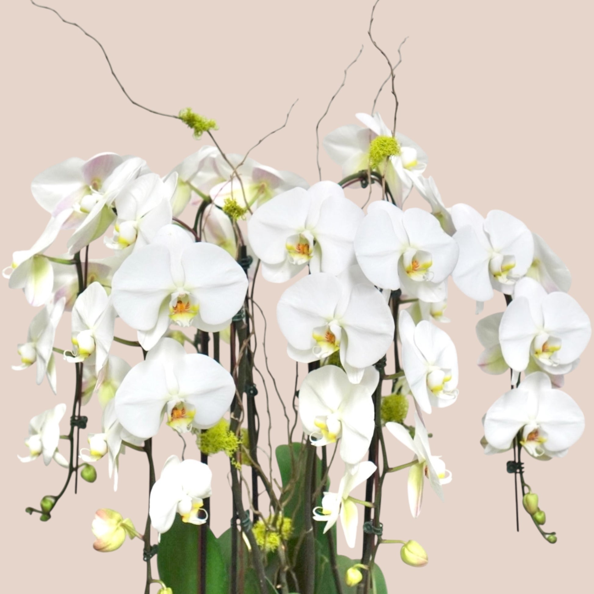• Elegant cascading Phalaenopsis orchids arranged in a low-profile white ceramic bowl