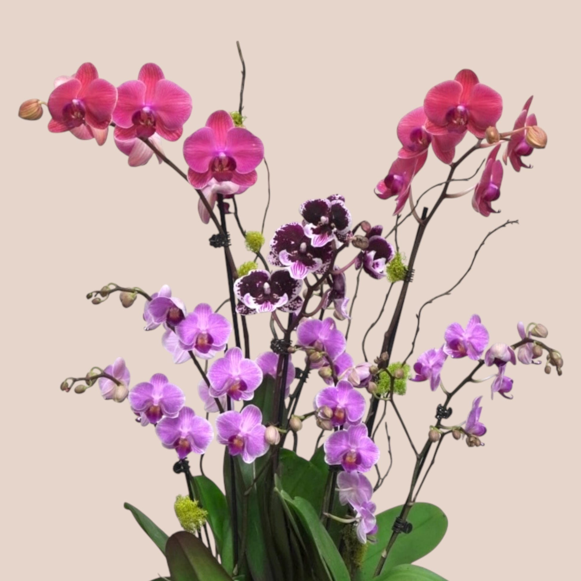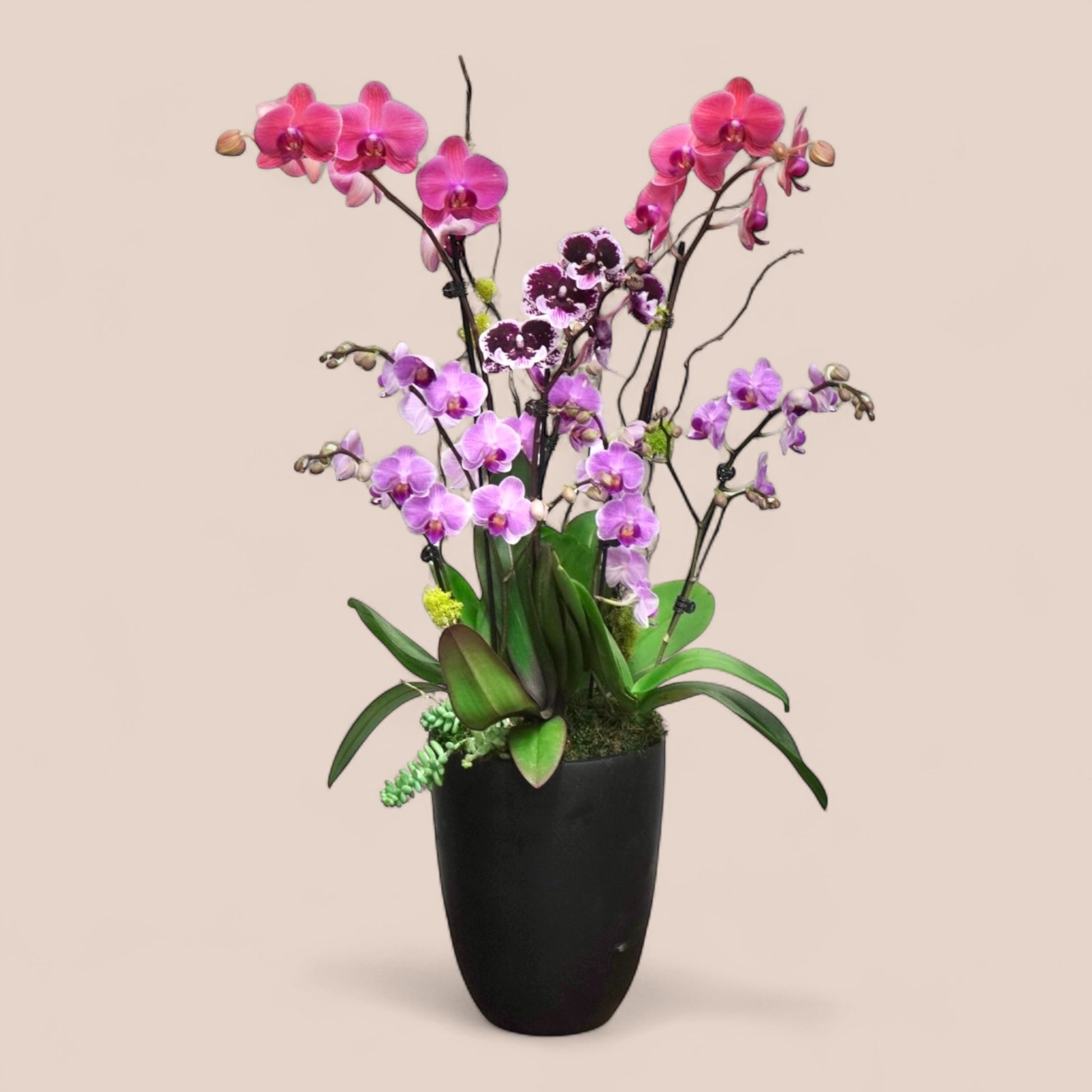 • Stunning arrangement featuring vivid pink and rich purple Phalaenopsis orchids