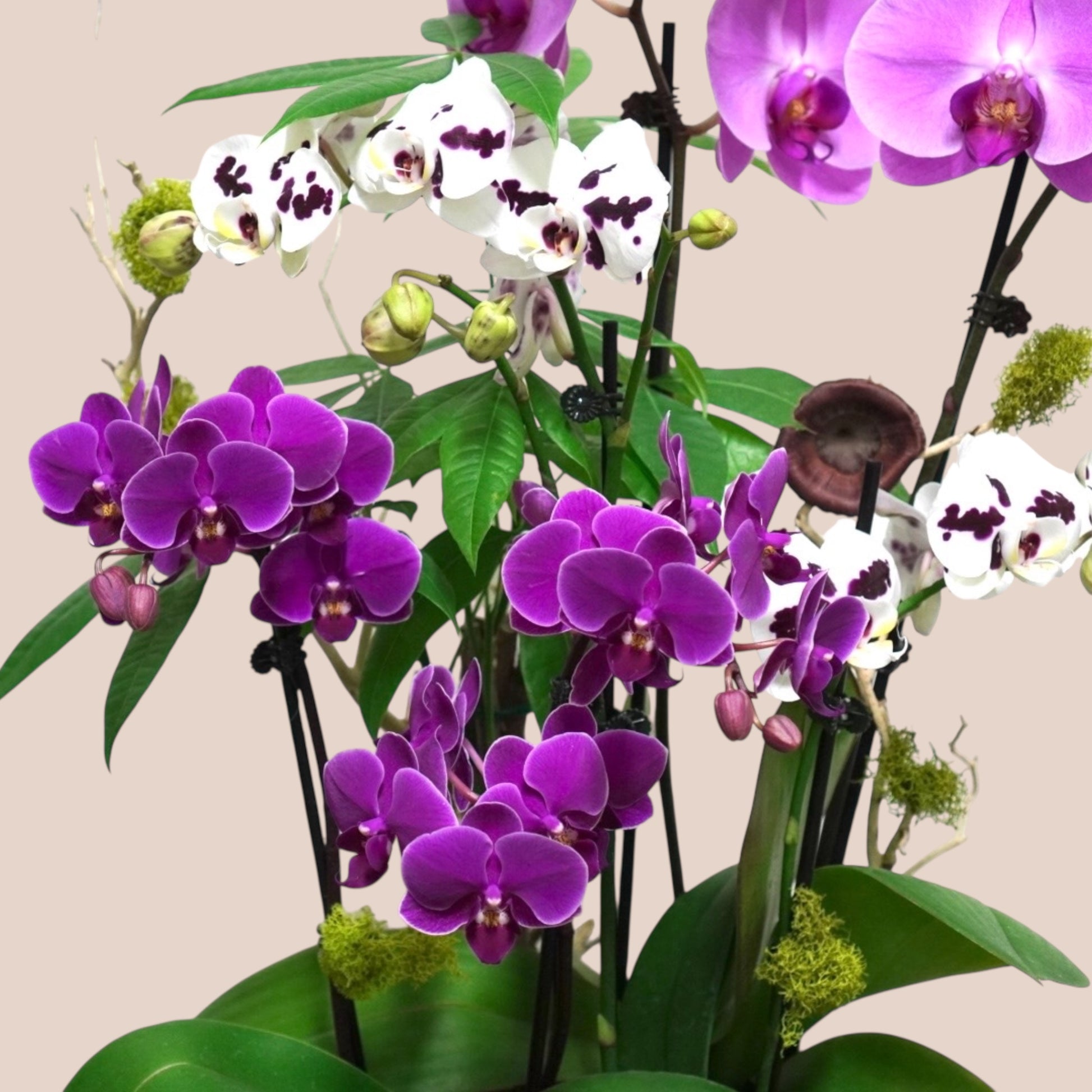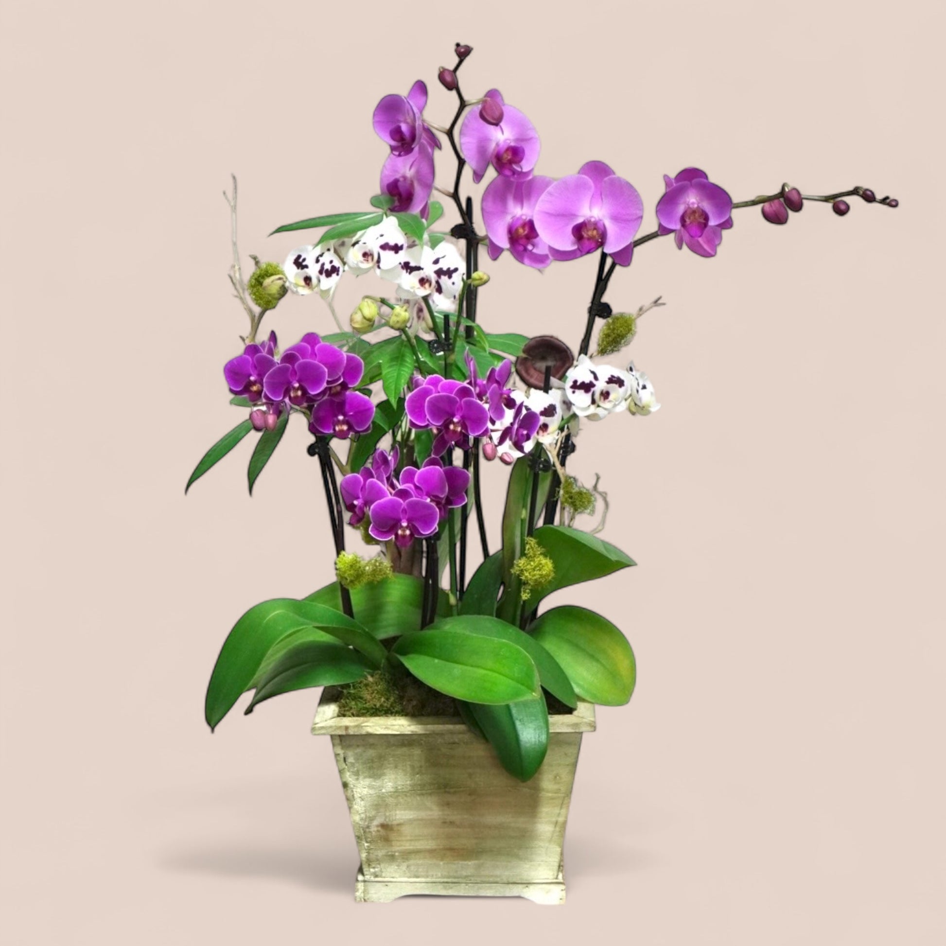 • Arrangement includes multiple purple-toned Phalaenopsis orchids