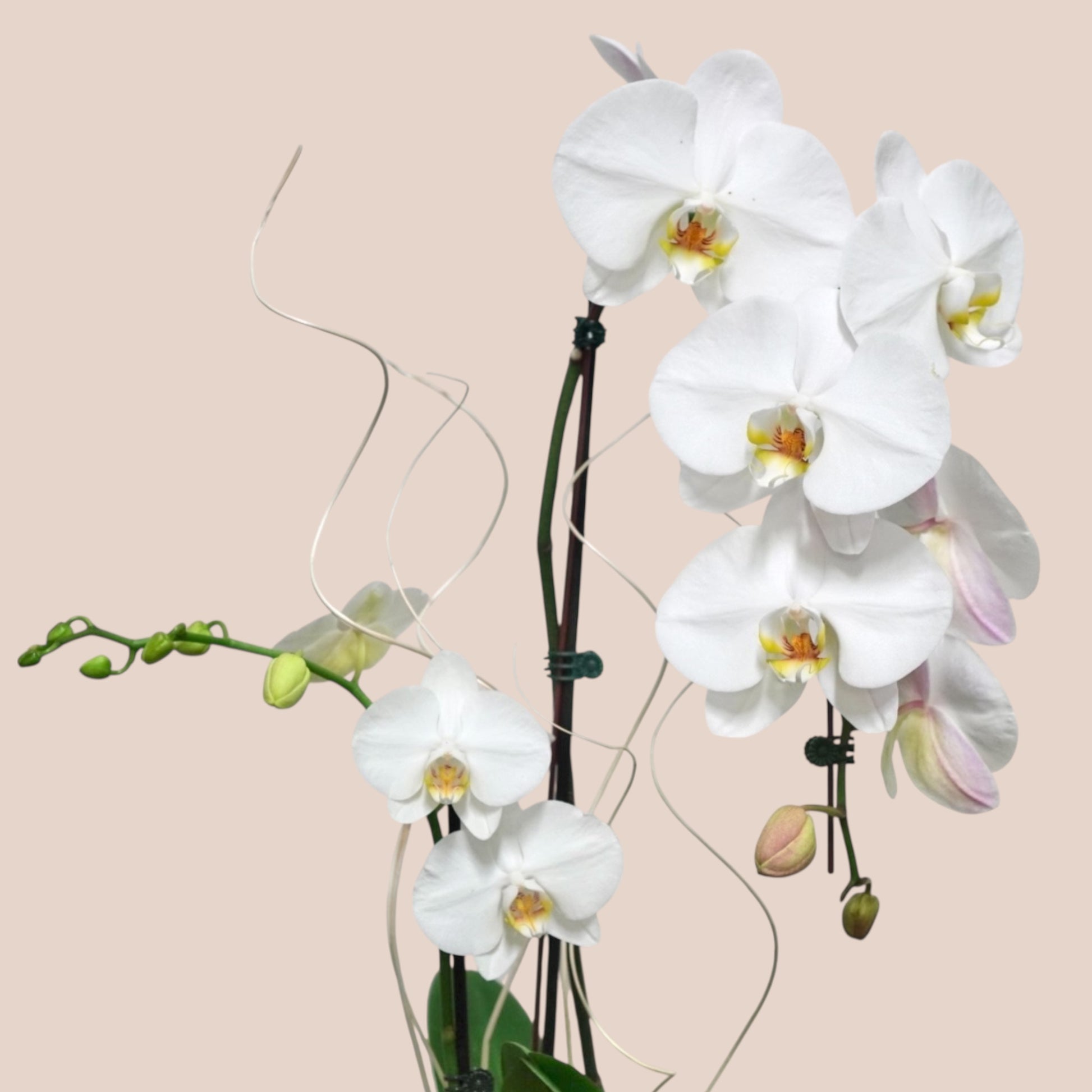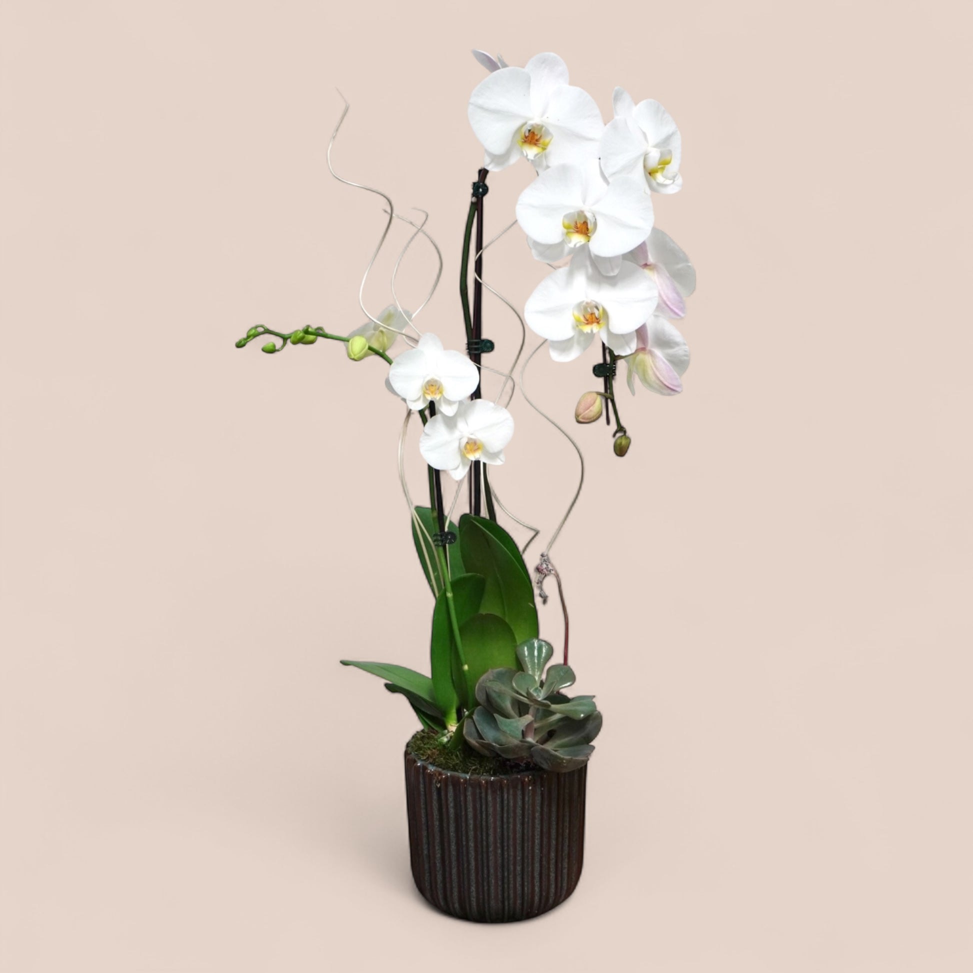 • Elegant white orchids in a sleek black ribbed ceramic pot