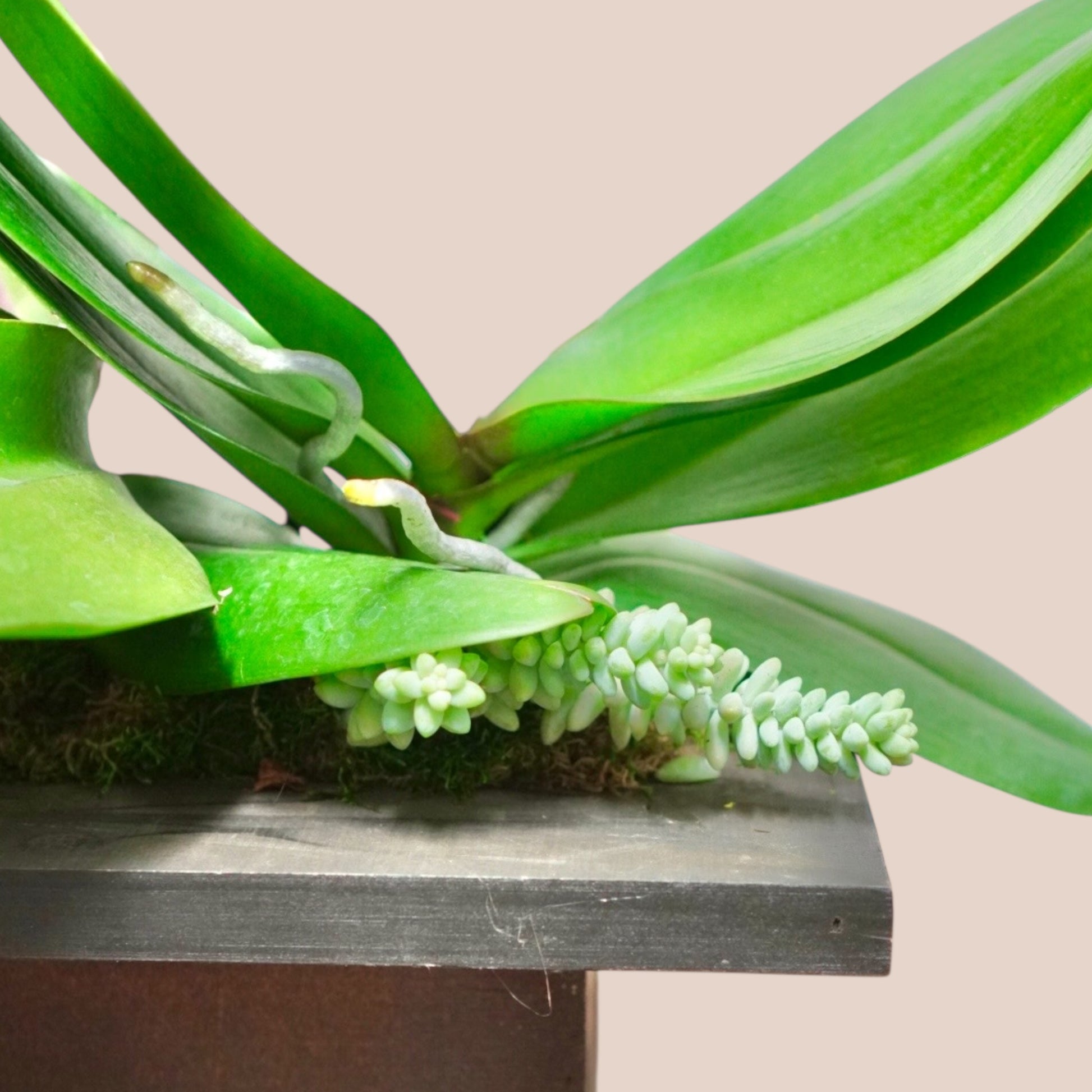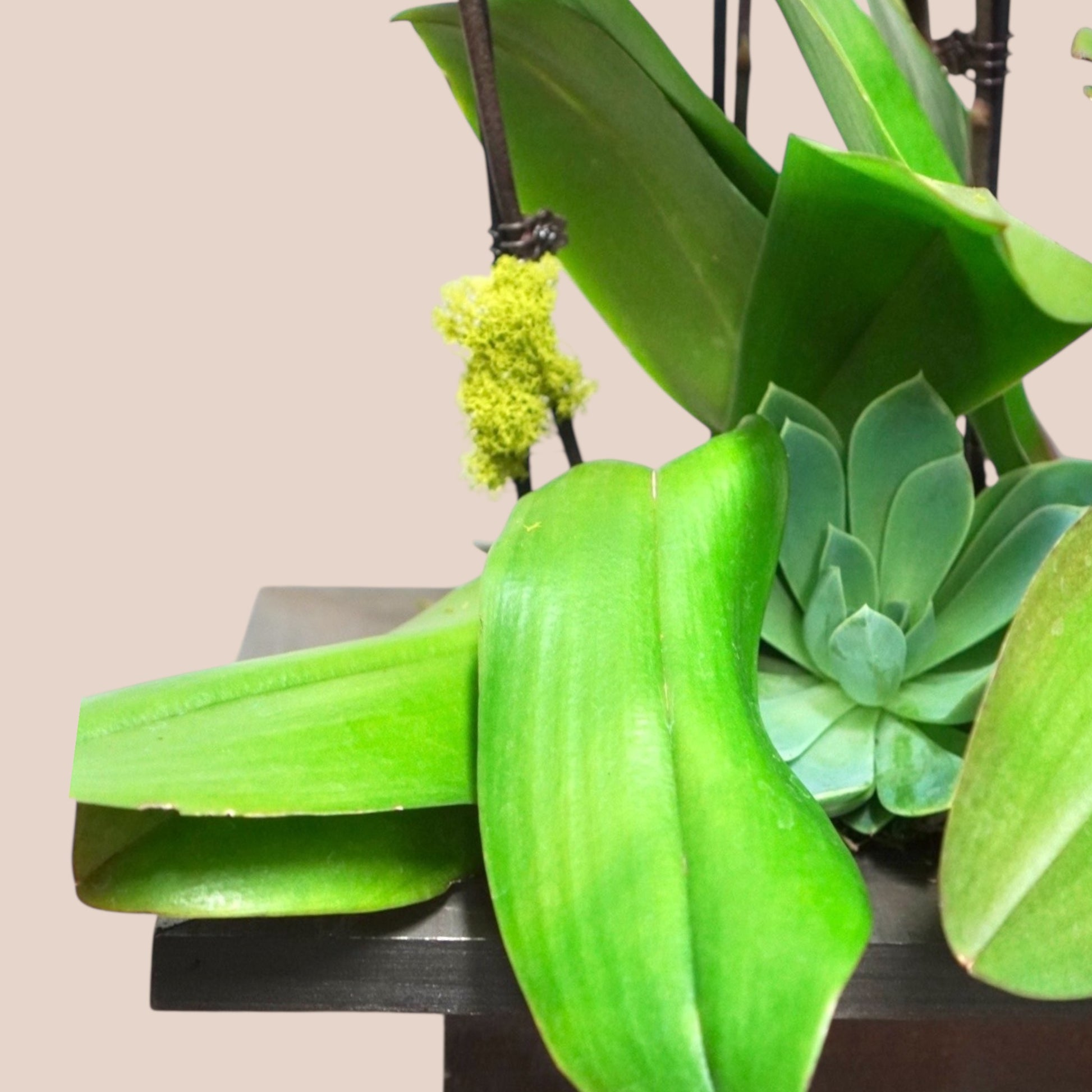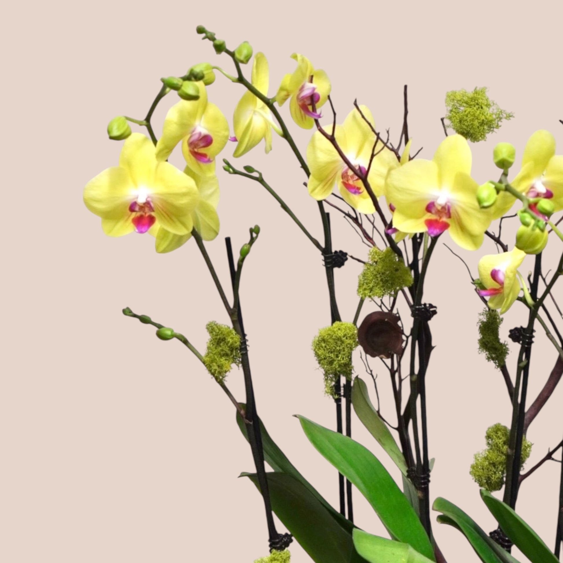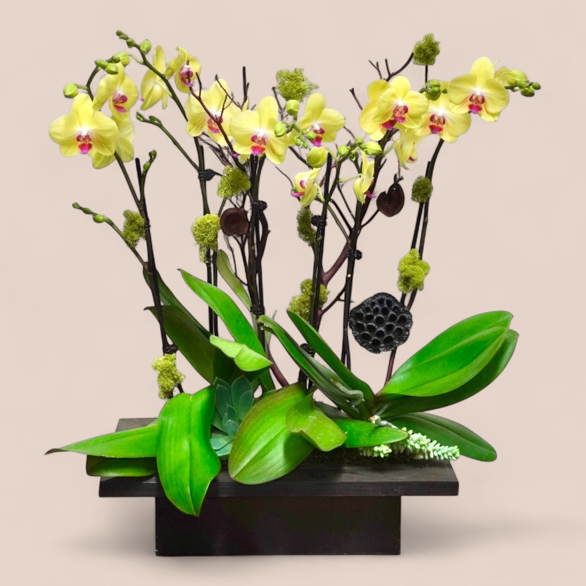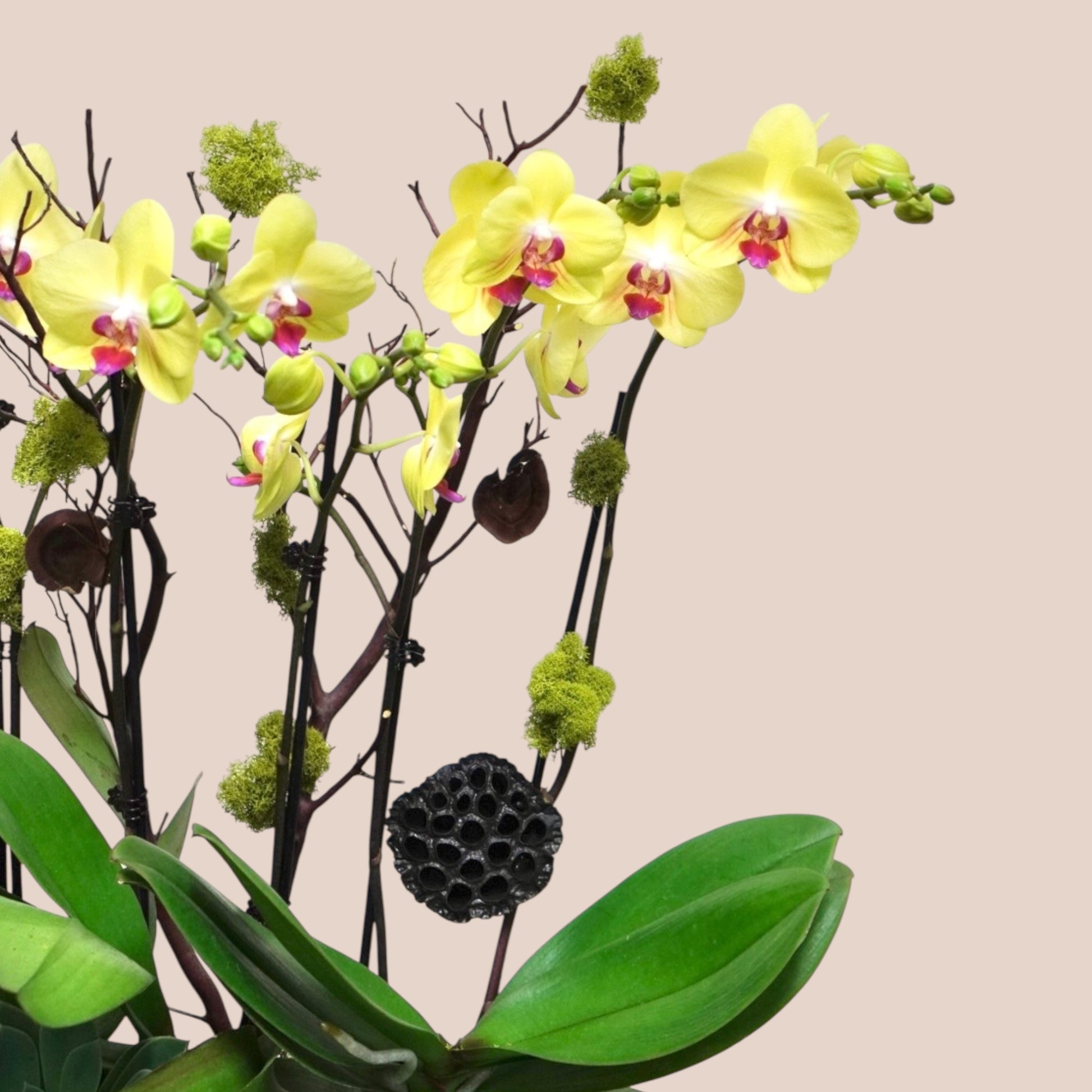 • Features compact yellow Phalaenopsis orchids arranged in a low ceramic container