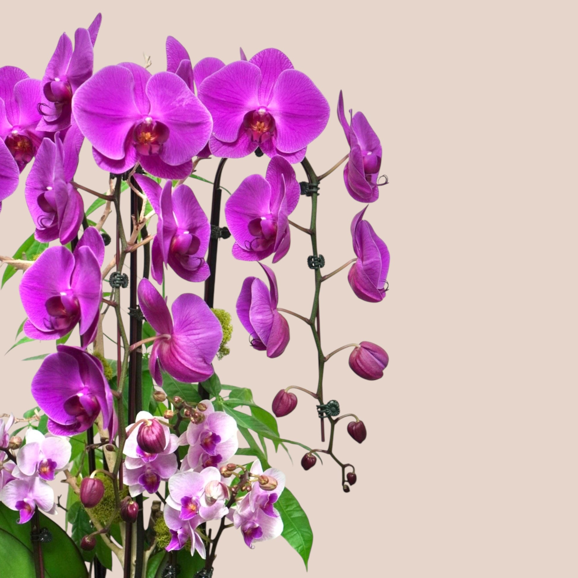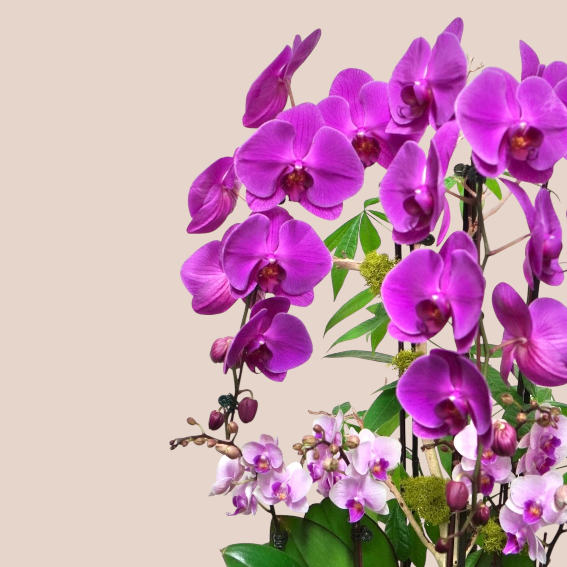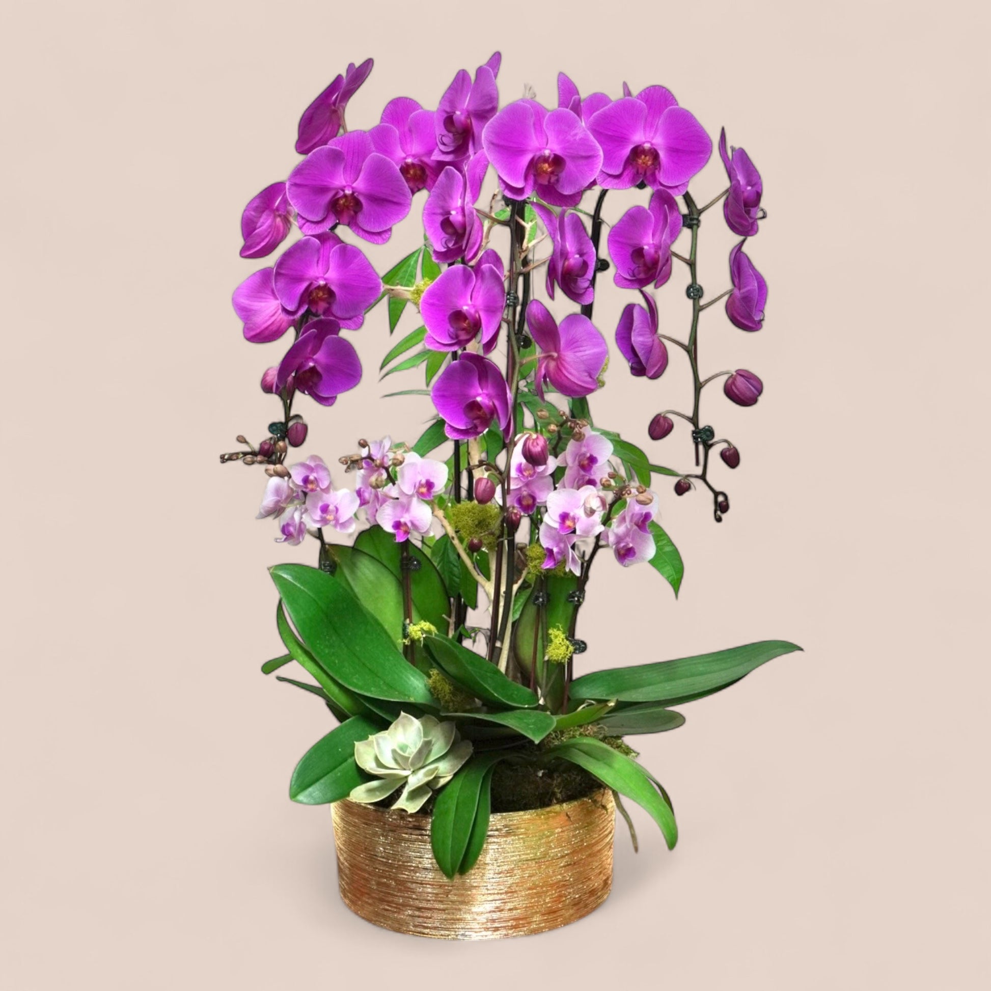 • Features a rich mix of deep purple and lavender Phalaenopsis orchids