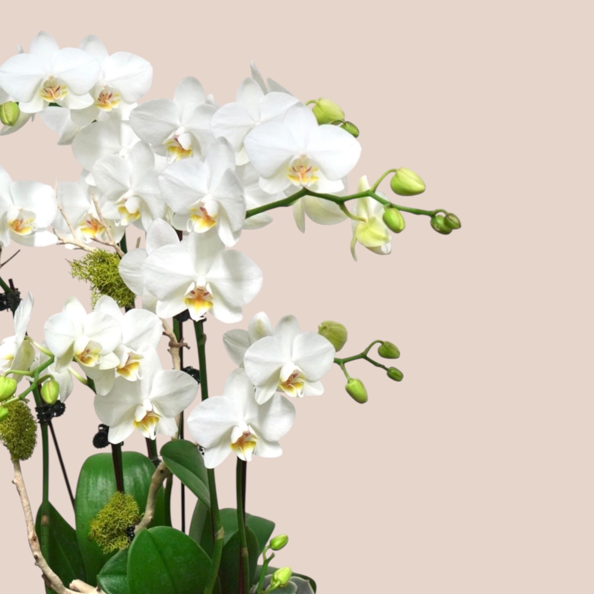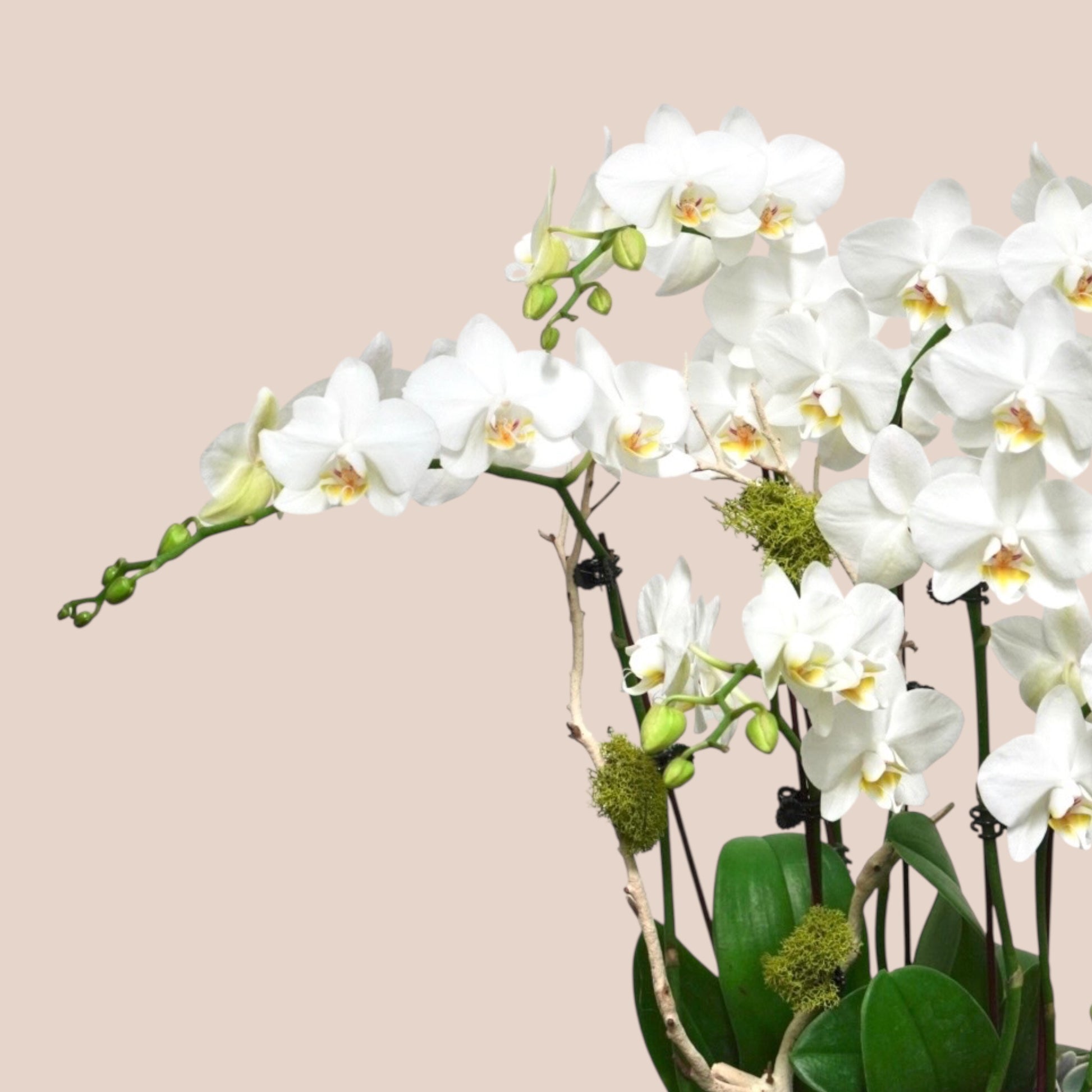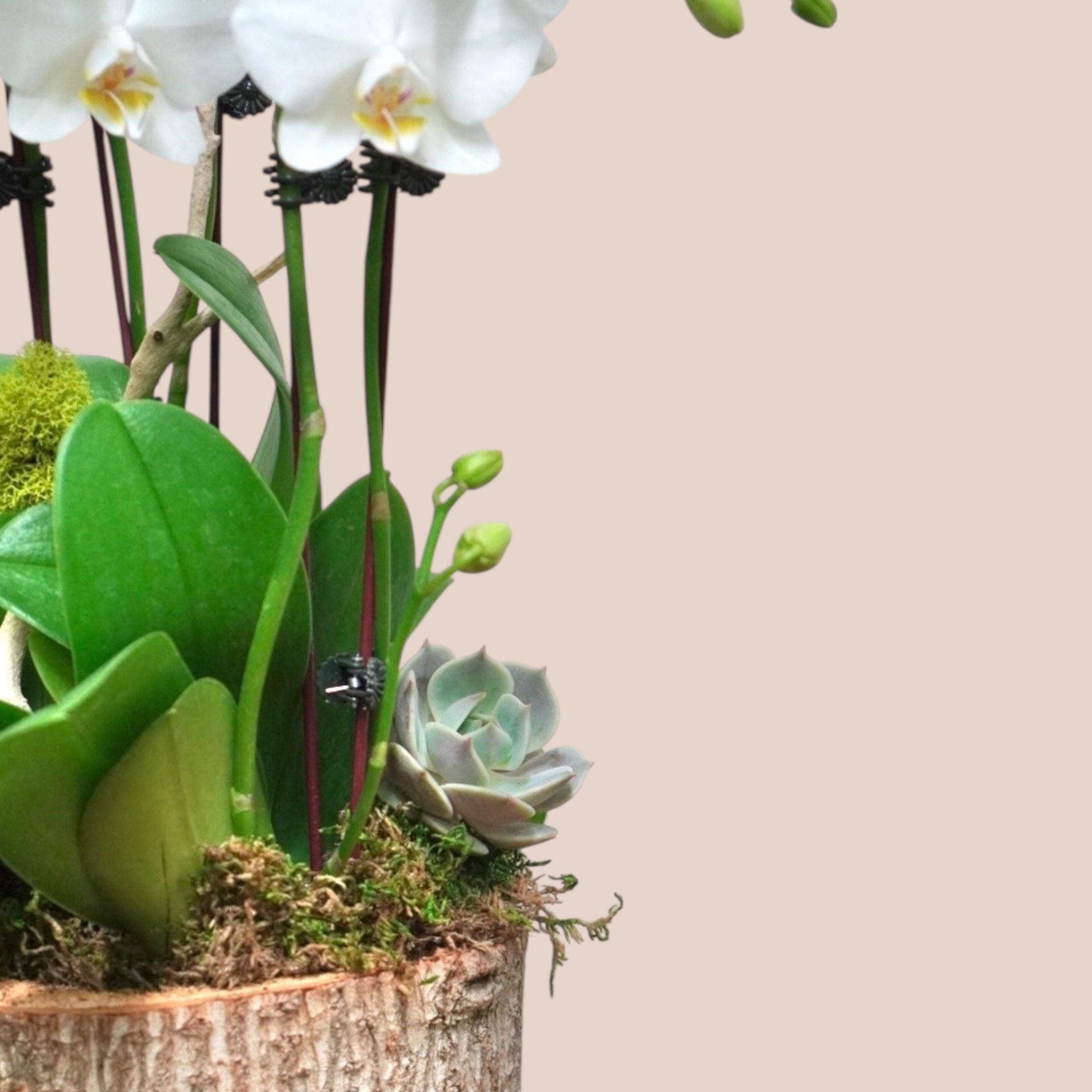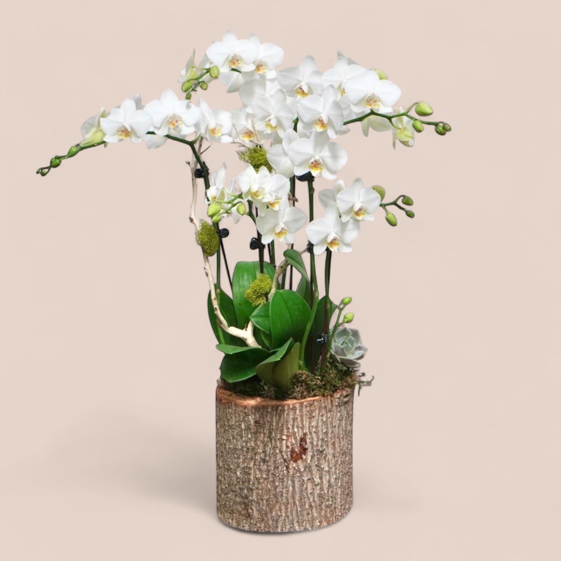 • Elegant Phalaenopsis orchids in a rustic wood-finish pot