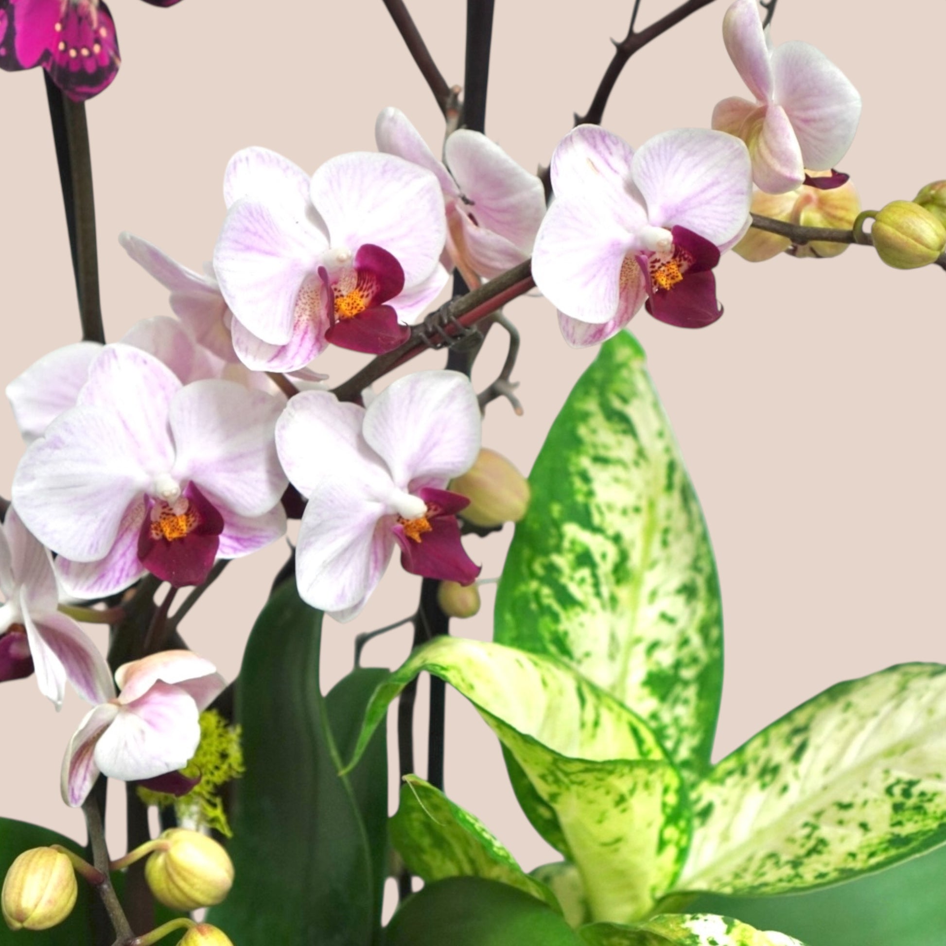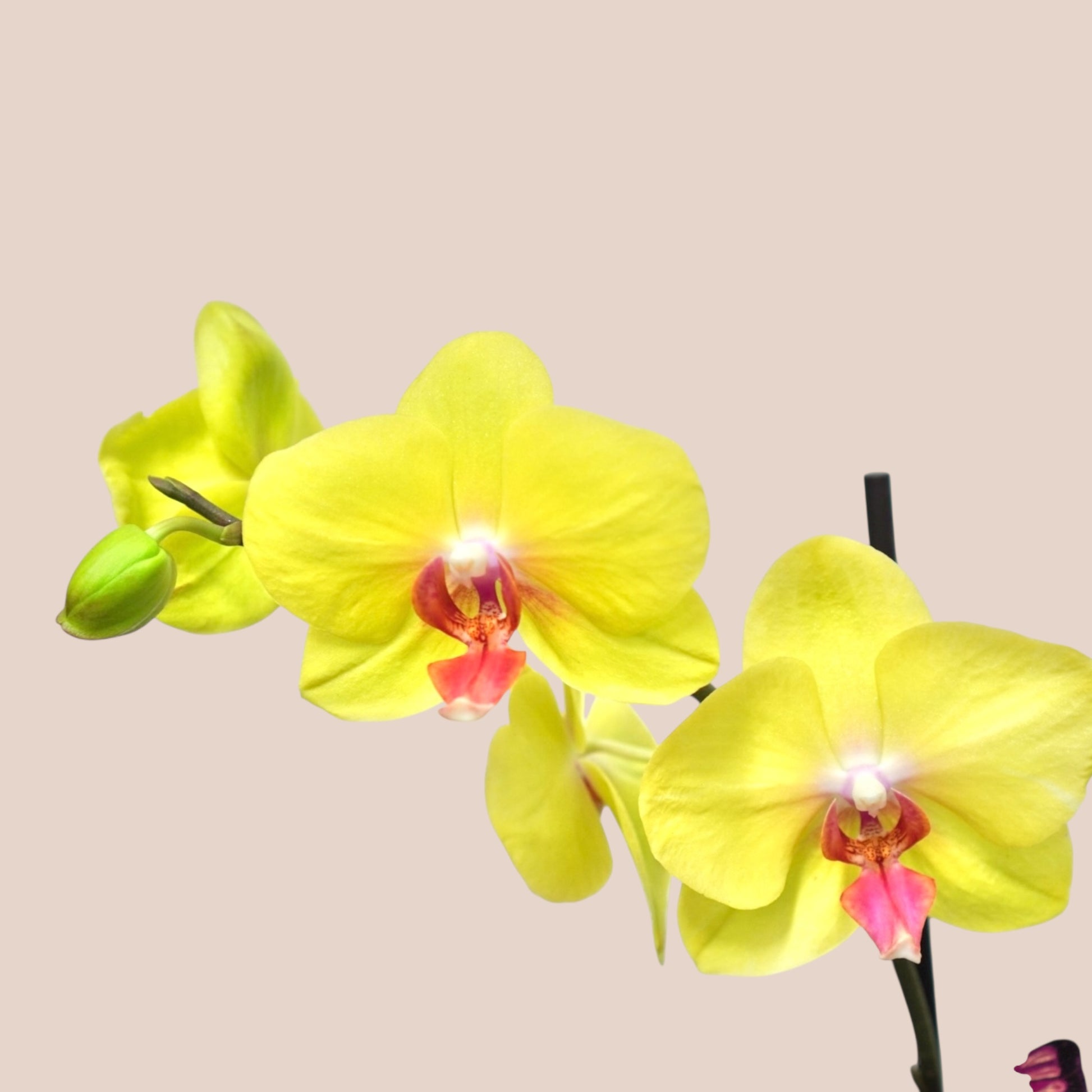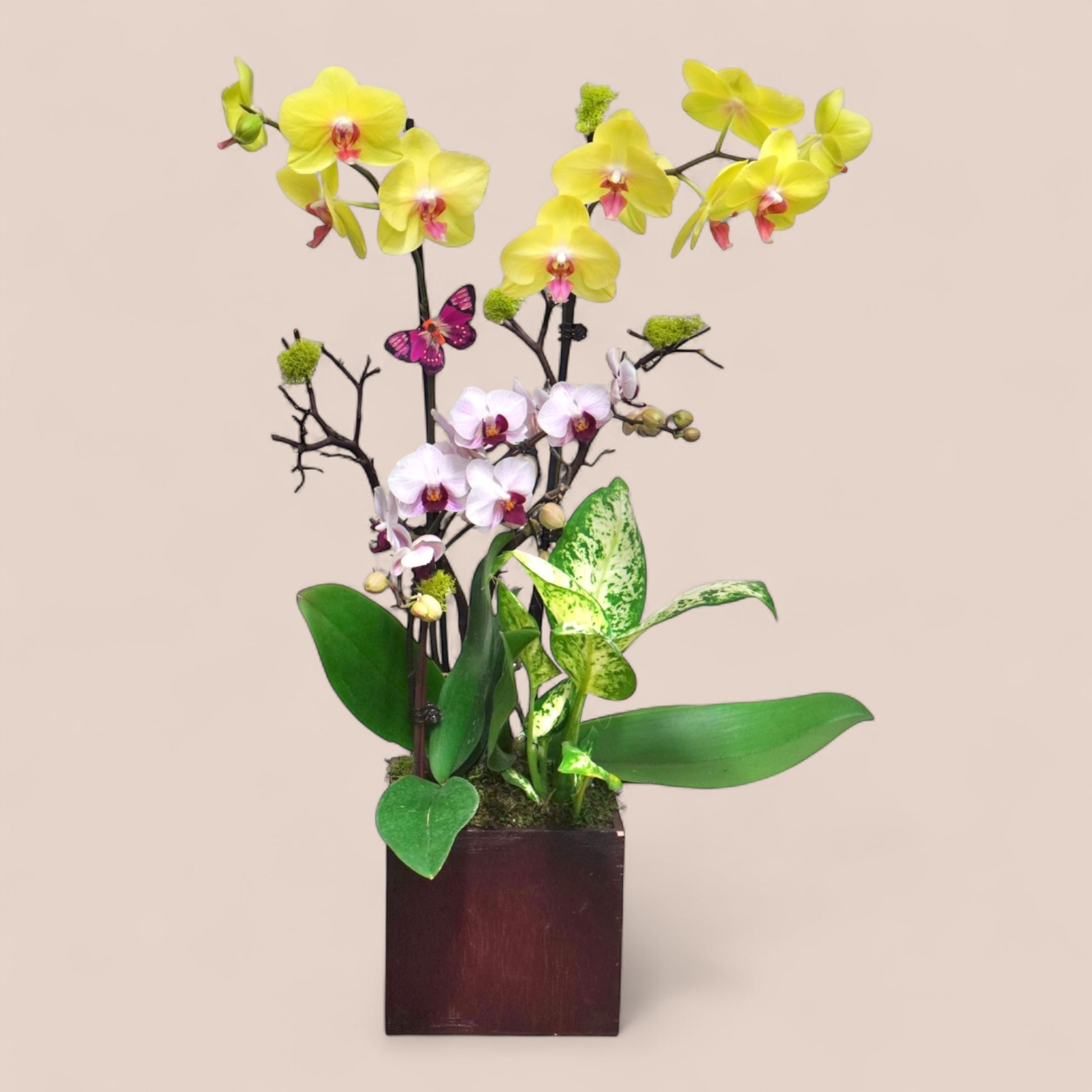 • Features vibrant yellow and soft lavender Phalaenopsis orchids